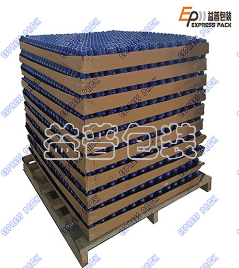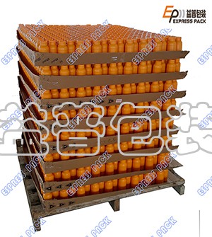 工作時,塑料瓶通過進瓶輸送線進入碼垛機,按照一定排列順序進瓶,當達到預設每一層空瓶數量時,移載裝置將整層瓶子平移到垛板上,隔板供給裝置從隔板倉中取出隔板放置在碼垛工位,然后繼續下一層,重復上述動作,當達到預設層數時,通過輸送鏈自動將滿垛產品輸送。