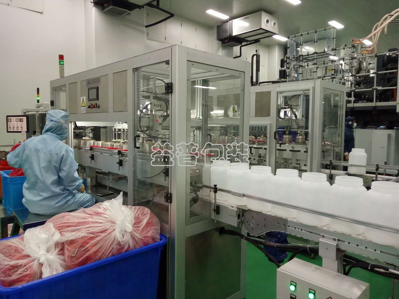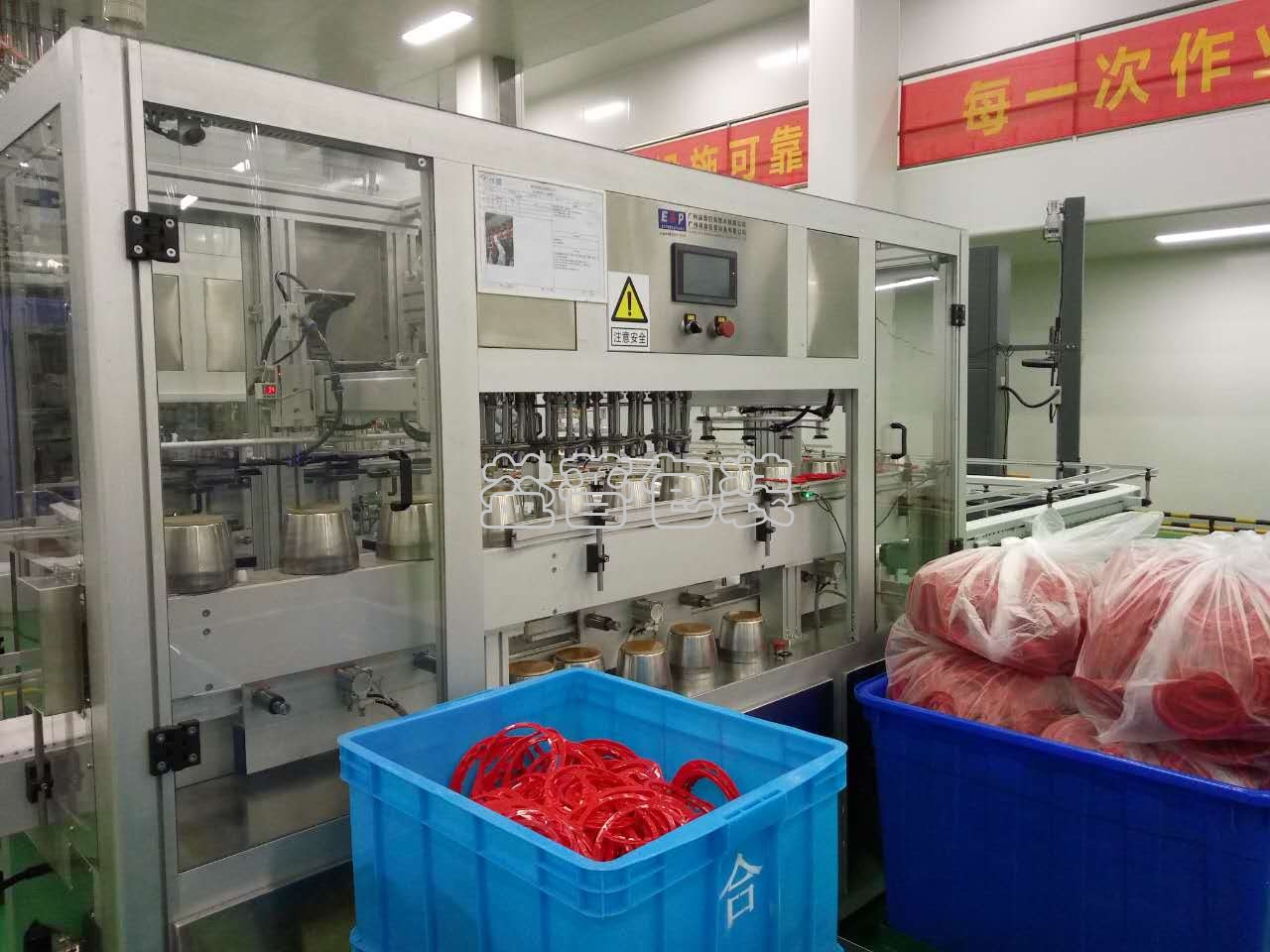 設(shè)備由進(jìn)瓶輸送線,模具輸送線,放模具裝置,壓提環(huán)裝置,取模具裝置,模具,定位裝置,架體,控制系統(tǒng)等組成。