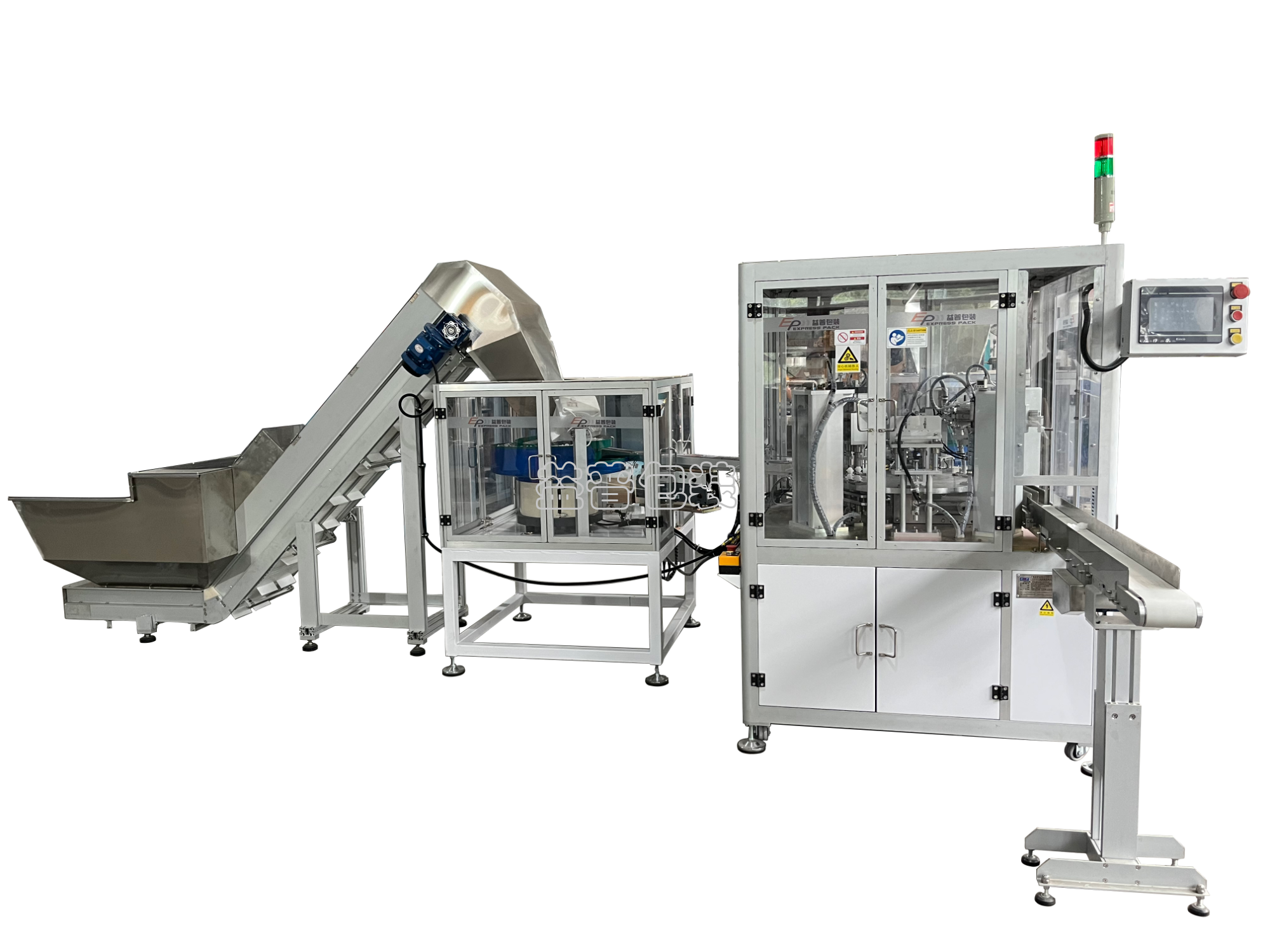 該系統由瓶蓋料倉,理料系統,主機組合蓋組成。該機型主要為自立袋食品包裝的吸嘴蓋實現自動組裝。生產過程:工人將內外蓋分別倒入各自料倉,有提升輸送機送入理料系統。理料系統將內外蓋按順序方向整理完成輸送入主機。主機完成內外蓋定位,通過伺服旋蓋頭將內外蓋組合完成。同時主機配有防斷環裝置,避免扭力過大導致安全環斷裂。可選配視覺檢測檢測斷環及外觀黑點。組合蓋最高速度約為50個/分鐘。
