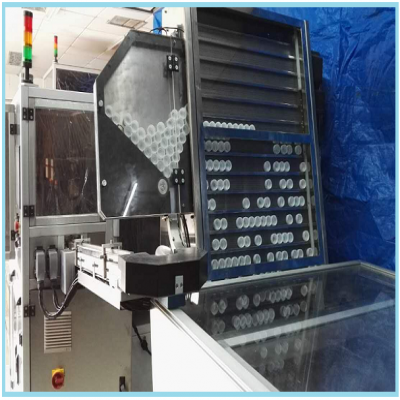 人工將蓋子加入儲蓋倉進行存放,儲蓋倉的蓋子將自動定量及以設定的速度提升理蓋爬坡帶...